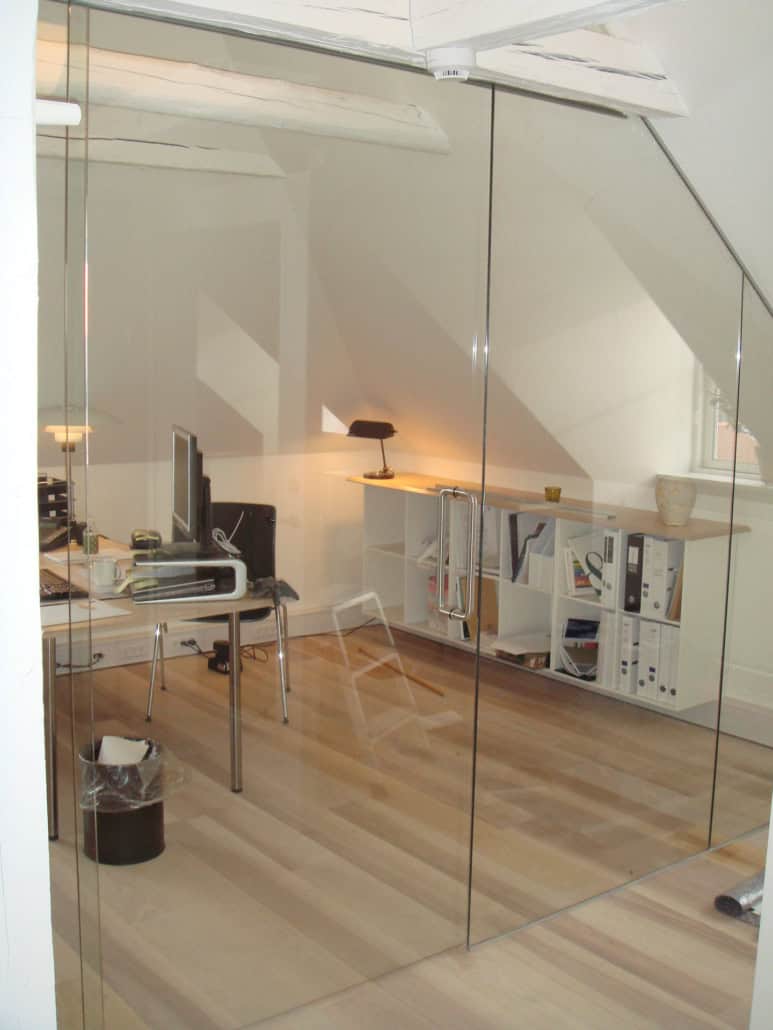 At bruge glas giver ikke kun mulighed for at få glæde af lysindfald. En dør eller væg i glas giver en unik mulighed for at afskærmning af hele rum eller områder for eksempel en garderobe, et printerrum eller et kontorlandskab.